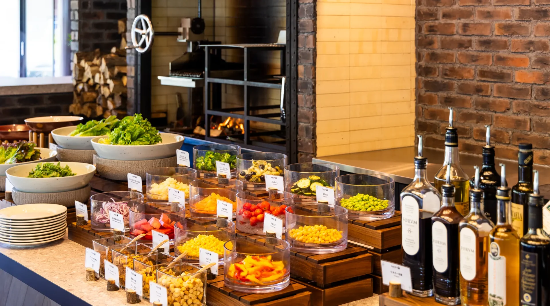 店内に入ると、落ち着いたウッド調の空間と、薪火のやわらかな香り。